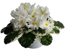 Плотная шапка крупных волнистых белых цветов с напечатками глубокого синего цвета на отличных цветоносах, ярко-зеленые с белым ровные листья формируют идеальную розетку. Средний размер цветов 6-7 см, отдельные дорастают до 8 см, цветение…